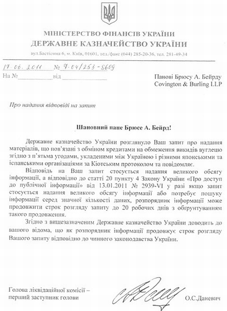 Він продемонстрував журналістам відповідь Державного казначейства від 17 червня 2011 року на адресу компанії Covington & Burling.