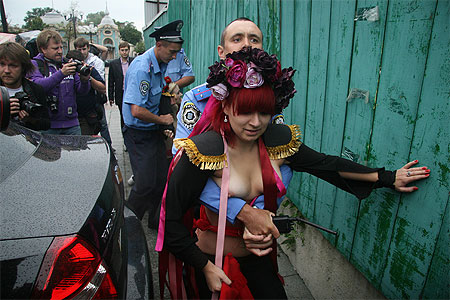 Дiвчата у вiночках на головах i топлес пробiгли бiля центрального входу будiвлi парламенту, викрикуючи при цьому: "Геть бичачу реформу!".
