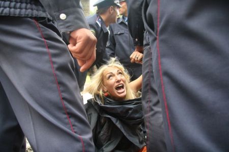 Активістки FEMEN з'їжджаються до Печерського районного відділення міліції, щоб вимагати негайного звільнення затриманих активісток.