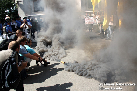 Учасники акції проти політичних репресій, що пройшла біля адміністрації президента на вулиці Банковій в Києві в середу, кидали димові шашки.