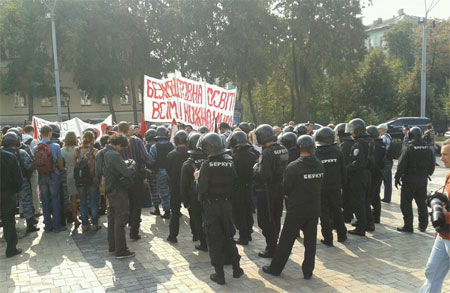 Студенти стояли навпроти мiлiцiонерiв iз прапорами i транспарантами та скандували гасла: "Студенти всього свiту за вiльну освiту", "Ви нам корупцiю - ми вам революцiю", "Геть ментовське свавiлля".