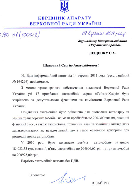 Редакція "Української правди" звернулася до апарату парламенту з проханням повідомити, куди пішли закуплені минулого року 17 автомобілів Toyota Camry.