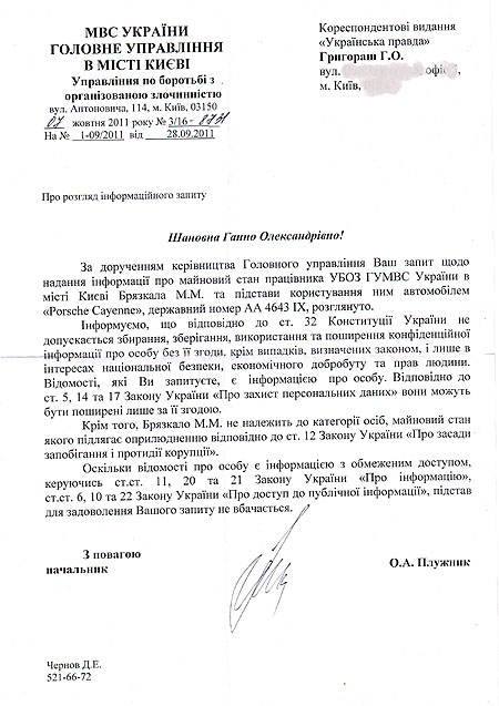 Про це повідомив начальник Київського УБОЗ Плужника у відповідь на запит "Української правди", в якому містилося прохання надати декларацію про доходи Брязкала.