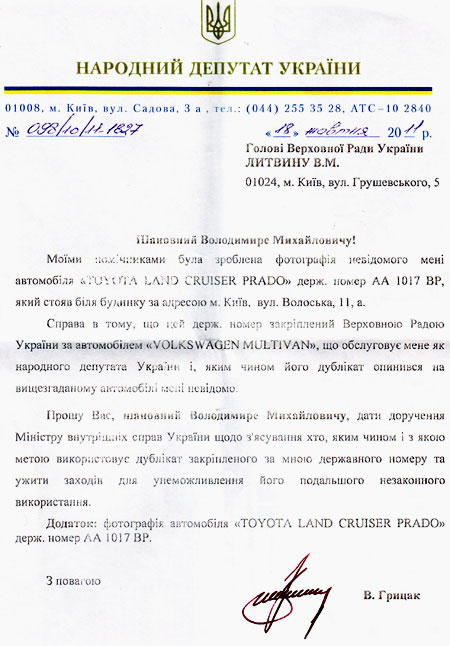 Грицак просить Литвина з'ясувати в МВС, "яким чином і з якою метою використовується дублікат закріпленого за мною державного номеру і ужити заходів для унеможливлення його подальшого незаконного використання".