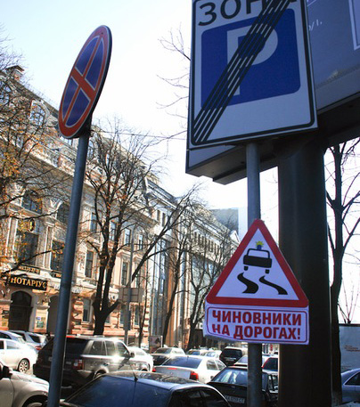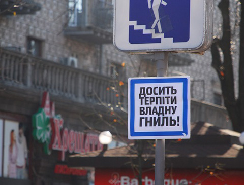 На знаках є написи: "Міліція вбиває", "Обережно, чиновники на дорогах", "Досить терпіти владну гниль!", "ЯНК, ПНХ!".