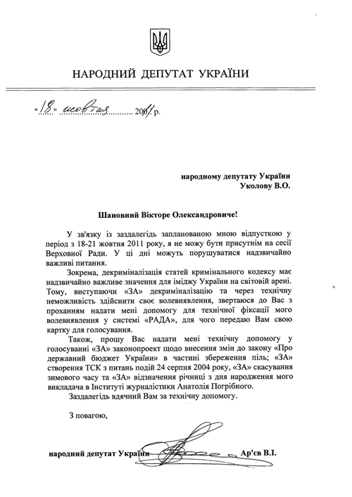 "Можливо, мене вибачає те, що ці голосування не були визначальними, адже голосування відбулись би і без картки Володимира Ар'єва, але він залишив документально оформлене доручення на моє ім'я, бо вважав, що голосування має засвідчити його політичну позицію щодо цих питань", - зазначив депутат.