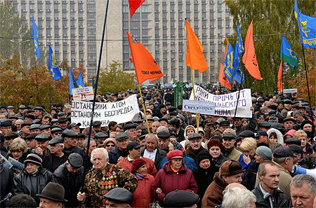 Учасники акції - члени профспілкових об'єднань, громадських та церковних організацій, представники Комітету опору диктатурі в Донецькій області.