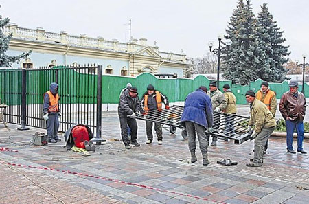 Під Радою другий день монтують паркан: "Те, що швидко ставиться, погано стоїть"