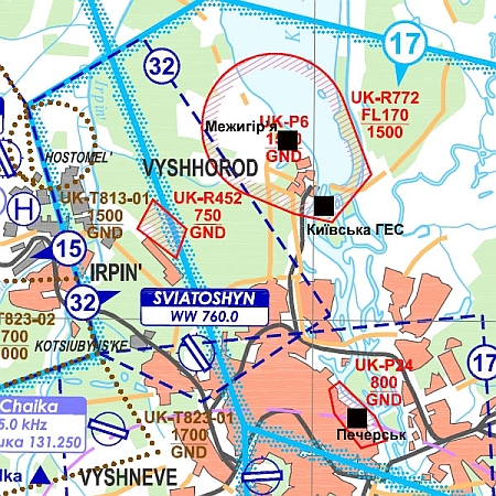 На авіанавігаційній карті можна побачити також зону, заборонену для польотів, над Печерськом, де розташовано будівлі Верховної Ради, Кабінету міністрів і Адміністрації президента.