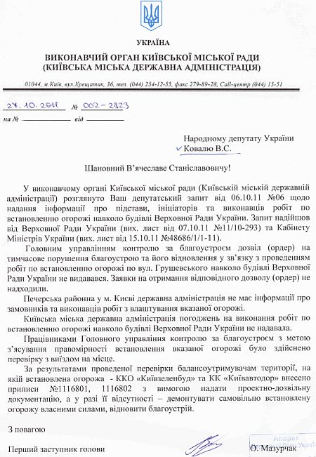 "Головним управлінням контролю за благоустроєм дозвіл (ордер) на тимчасове порушення благоустрою та його відновлення у зв’язку з проведенням робіт по відновленню огорожі по вул. Грушевського навколо будівлі Верховної Ради не видавався. Заявки на отримання відповідного дозволу (ордеру) не надходили", - сказано в ньому.