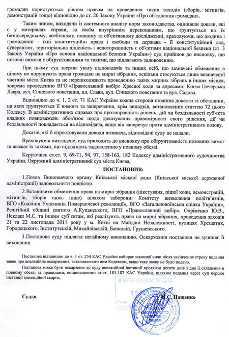 Рішенням суду 21 та 22 листопада забороняється проведення заходів та Майдані Незалежності, вулицях Хрещатик, Городецького, Інститутській, Михайлівській, Банковій, Грушевського.