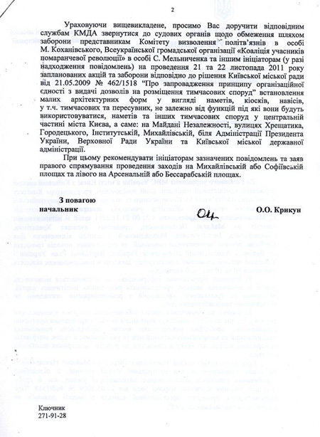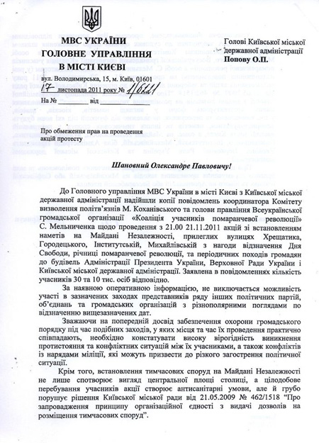 "Просимо звернутися до суду з метою заборони проведення 22 листопада 2011 року акцій протесту біля об’єктів відвідування згідно програми візиту та на маршрутах під'їзду до них", - йдеться в листі.