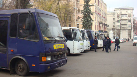 Так, на вулиці Городецького стоїть 3 великих автобуси з міліцією, один автобус "Богдан", а також 5 патрульних джипів.