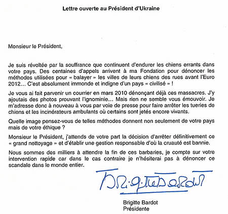Бріджит Бардо відзначає, що в березні 2010 вона вже писала Януковичу листа, "в якому скаржилася на цю бійню, а також додала на доказ цієї ницості фотографії".