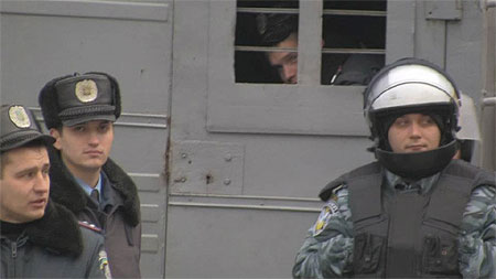 Під поштамтом продовжують стояти люди, які святкують річницю Майдану. Подалі від них відділені кордоном Беркуту стоять люди Калашникова.