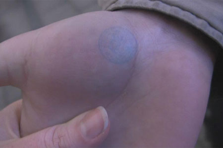 | Печатка на руці одного з мітингувальників. Раніше "Українська правда" писала, що в таборі Калашнікова під Печерським судом людям ставили такі печатки, а потім видавали гроші |