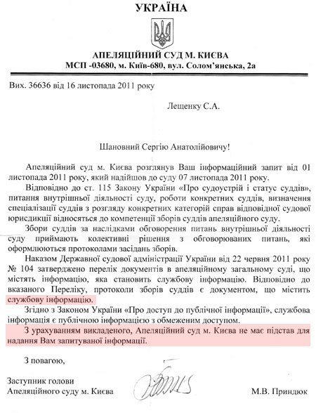 "З урахуванням викладеного, Апеляційний суд Києва не має підстав для надання Вам запитуваної інформації", - ідеться в листі.