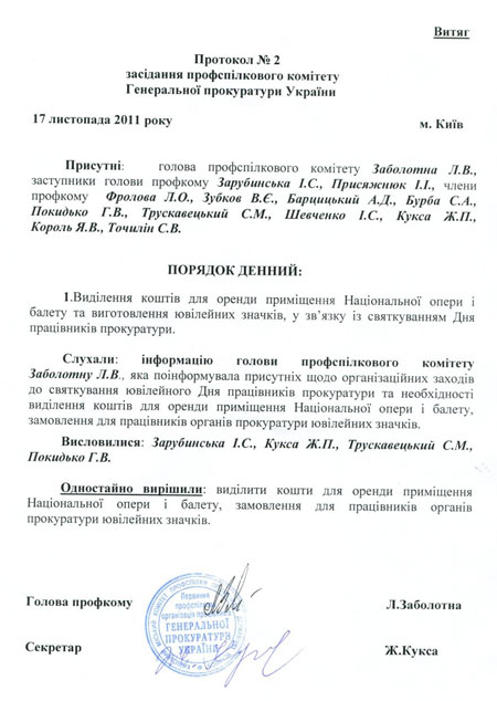 Усі фінансові витрати на підготовку та проведення святкування 20-ї річниці Дня працівників прокуратури відбувалися за рахунок коштів профспілки.