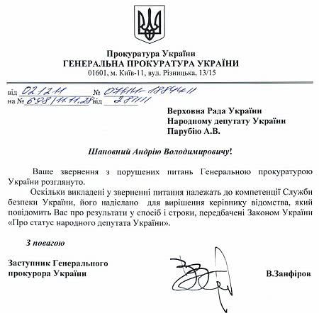 "Я отримав відповіді як від Генпрокуратури, так і від Служби безпеки України. СБУ написала, що це питання знаходиться у підслідності ГПУ, а Генпрокуратура – що це питання у підслідності СБУ", - розповів депутат.