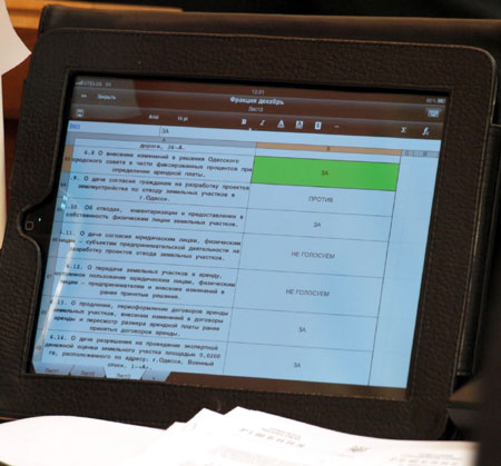 На зображенні видно планшетний комп'ютер одного з депутатів міськради з відкритим файлом під назвою "Фракція Грудень", що містить докладну інструкцію того, як слід голосувати з того чи іншого питання.