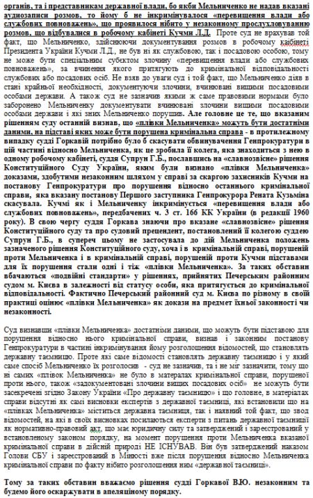 Адвокат спростовує висновок судді про те, що заяви Мельниченка є наклепом на "Кучму, Азарова, Литвина, Деркача, Кравченка та інших", посилаючись на свідчення Пукача, дані ним у справі про вбивство журналіста Георгія Гонгадзе, а також матеріали справи проти Кучми та висновки Тимчасових слідчих комісій Верховної Ради.