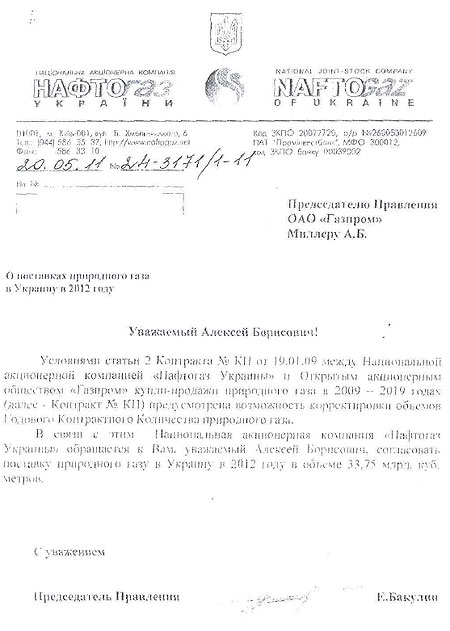 "Нафтогаз України" заявляє, що ще 25 травня 2011 року направив до "Газпрому" лист з пропозицією погодити поставку природного газу в Україну в 2012 році в об’ємі 33,75 мільярдів кубометрів.