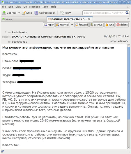 У листі, отриманому від адресанта Максима Перліна, зазначається, що платні коментатори "вміють оперативно працювати з блогосферою та усіма соцмережами: TW, FB, VK".