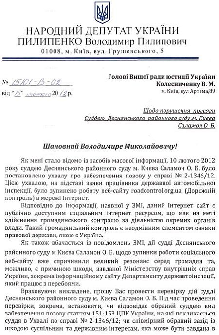 Цей лист є реакцією на ухвалу судді Деснянського райсуду Києва Ольги Саламон від 10 лютого, якою на підставі скарги працівника Державтоінспекції було зупинено роботу сайту "Дорожній контроль".