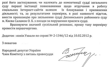 Депутат просить провести таку перевірку першочергово та за її результатами, в разі наявності підстав, звільнити Саламон із посади судді "за порушення присяги".