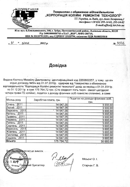 Документ засвідчує, що губернатор Львівщини, окрім своєї зарплати керівника області (орієнтовно 8 тисяч гривень), упродовж 2011 року отримує також платню на підприємстві у розмірі майже 15 тисяч гривень щомісяця.