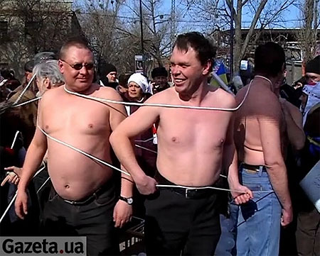 Людина в чорному пальто у масці Януковича на обличчі стала простягати руки до обплетених чоловіків.