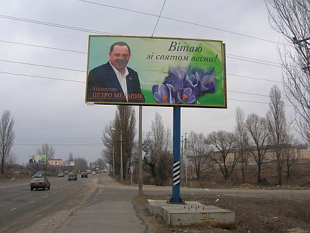 Білборд із привітанням народного депутата від Партії регіонів Петра Мельника у місті Вишневе обляпали фарбою.