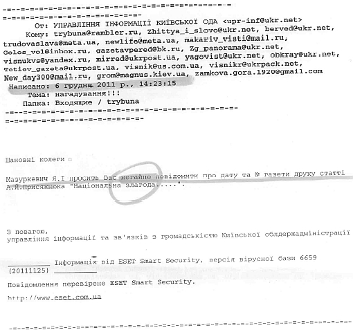 В листі від 1 грудня 2011 року управління просить повідомити "про дату (№ газети) розміщення на шпальтах видання статті А. Й. Присяжнюка "Національна єдність та злагода – єдиний шлях до розвитку та процвітання".