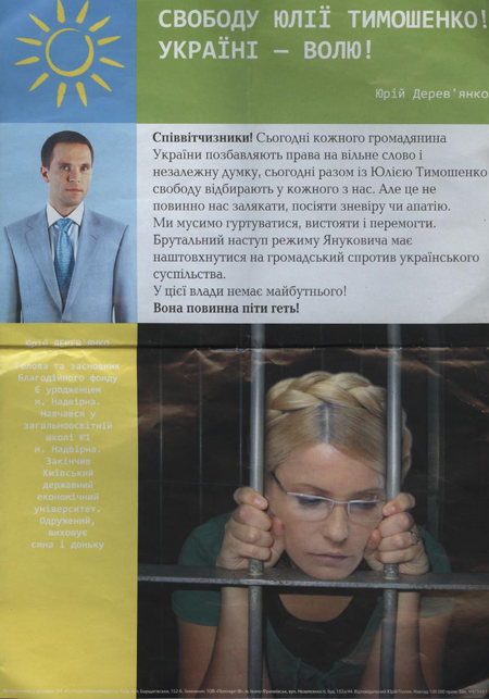Як повідомляє "Галицький кореспондент", "малява" оформлена як агітаційна листівка кандидата в народні депутати Юрія Дерев’янка: є фото і коротка біографія політика, заклик від його імені звільнити Тимошенко і зупинити "брутальний наступ режиму Януковича".