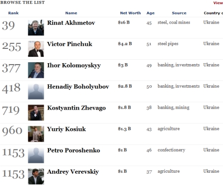 Бізнесмен Костянтин Жеваго, статок якого оцінили в 1,8 мільярда доларів, зайняв 719 місце. Юрій Косюк зі статками 1,3 мільярда доларів розмістився на 960 місці, 1153 місце розділили між собою Петро Порошенко (1 мільярд доларів) та Андрій Веревський (1 мільрд).