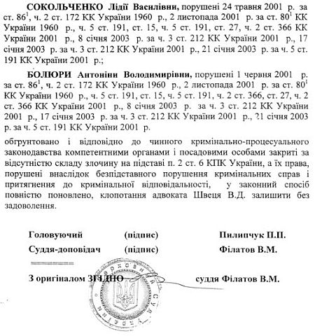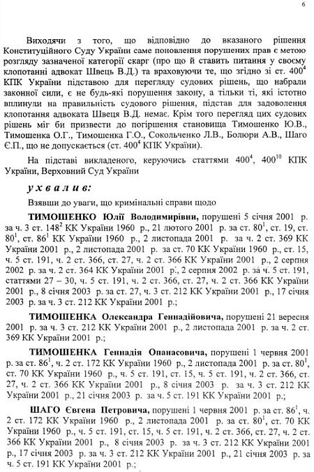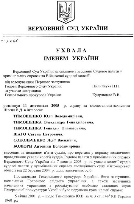 Партія екс-прем’єрки Тимошенко наводить текст ухвали Верховного суду від 11 листопада 2005 року, винесеної за клопотанням адвоката Швеця, який представляв інтереси Юлії, Олександра та Геннадія Тимошенків, а також Євгена Шаго, Лідії Сокольченко та Антоніни Болюри, які причетні до корпорації "Єдині енергетичні системи України".