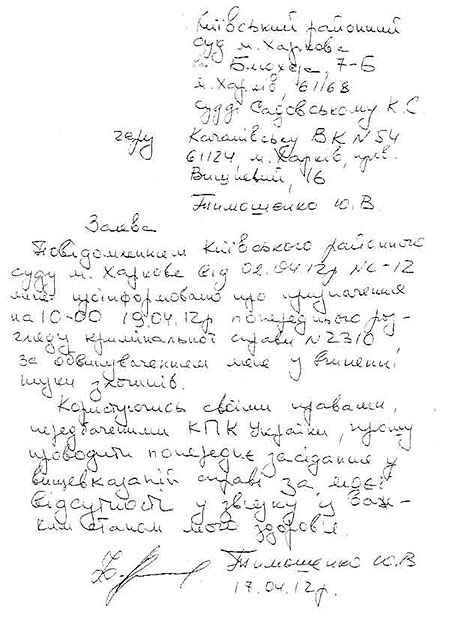 "Користуючись своїми правами, передбаченими КПК України, прошу проводити попереднє засідання у вищевказаній справі за моєї відсутності у зв’язку з важким станом мого здоров’я", - заявила Тимошенко.