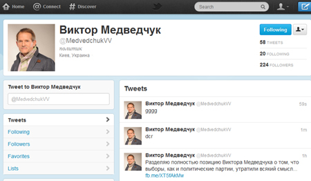 Раніше у Twitter Медведчука стояла переадресація з його сторінки у Facebook та Живого журналу.