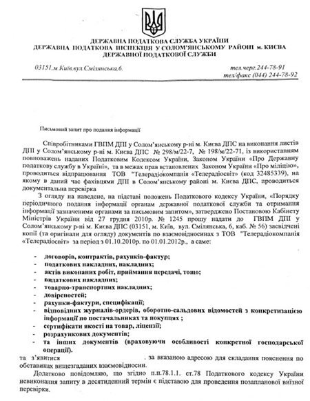 За інформацією ТВі, співробітники міліції намагались надати особам, які виконують замовлення від телеканалу листи, де податкова просить надати копії (та оригінали для огляду) документів по взаємовідносинах з телеканалом за період 1 жовтня 2010 року - 1 січня 2012 року.