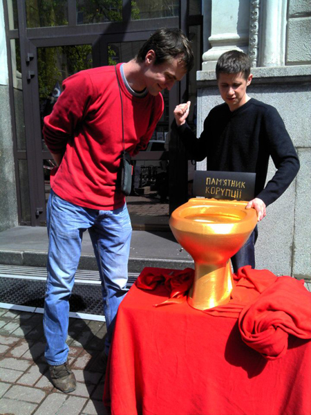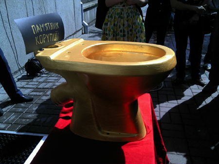 У четвер біля входу в НАК Нафтогаз у Києві активісти "Демократичного альянсу" встановили пам’ятник корупції - Золотий Унітаз.