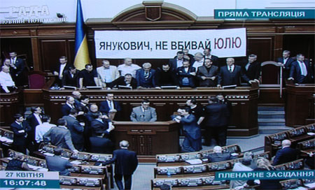БЮТ блокує парламент. Водночас перший віце-спікер Адам Мартинюк, який веде засідання сидить в депутатській ложі, де знаходиться місце депутата Ріната Ахметова.