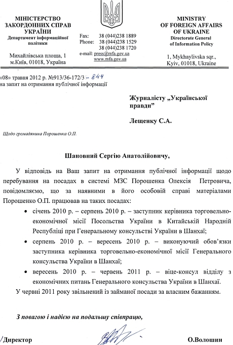 Згідно із відповіддю, у червні 2011 року він був звільнений за власним бажанням з посади віце-консула відділу з економічних питань у Генконсульстві в Шанхаї у віці 26 років.