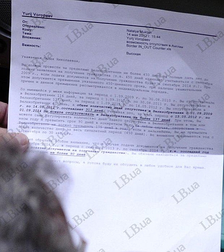 "За наявною у мене інформацією за період з 1.9.2009 р. По 30.8.2010 р. ви були відсутні у Великобританії 116 днів, за період з 1.9.2010 р. по 30.8.2011 р. ви були відсутні у Великобританії 137 днів, за період з 1.9.2011 р. по 14.5.2012 р. ви були відсутні у Великобританії 61 день, а загальна кількість днів відсутності в Великобританії з 1.9.2009 по 14.5.2012 складає 313 днів", - йдеться в листі.