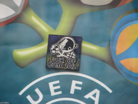 Наклейки "Fuck off Euro-2012" можна побачити на сіті-лайтах, дорожніх знаках, стінах, фан-зоні та інших місцях, повідомляє Gazeta.ua.