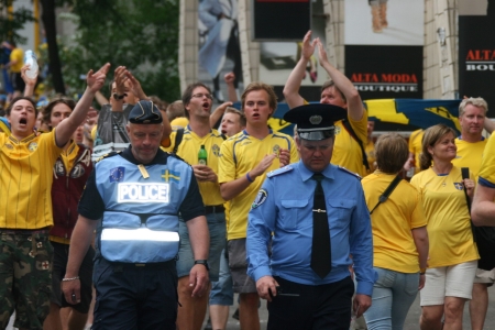 Більшість фанатів були одягнені в жовті футболки збірної Швеції, несли прапори своїх країн.