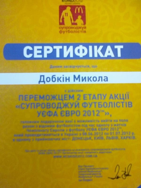 Крім того, чиновник опублікував сертифікат свого сина про перемогу в акції "Супроводжуй футболістів УЄФА Євро-2012".