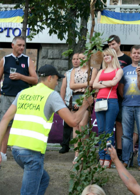 " 20-річний чоловік, житель Полтавської області, заліз на липу біля фан-зони. Стюарти й міліція кілька хвилин намагалися вмовити його злізти добровільно. Коли це не допомогло, вони спробували зняти його з дерева, у результаті чого парубок зламав гілку, на якій сидів, і впав вниз", - повідомили в столичному головкомі міліції.
