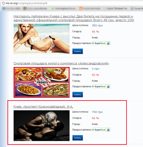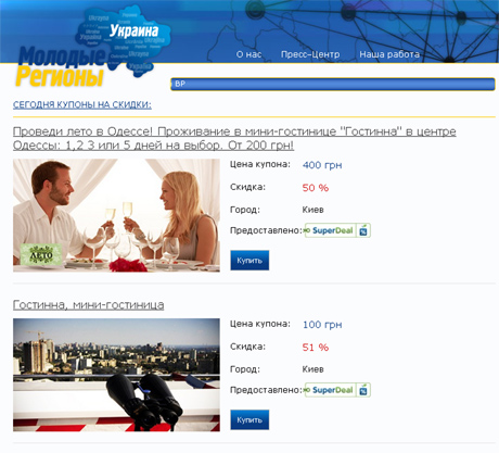 На сайті Молодих регіонів є деякі посилання, які не співпадають з зображеннями і описанням. З такими ж картинками на сайті компанії, що такі знижки постачає, пропонуються еротичні масажі зі знижкою 66% з гарантією дотримання анонімності.
