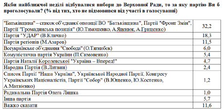 Разом з тим 18,3% киян висловили готовність проголосувати за Партію "Удар", за Партію регіонів – 11,5%, за ВО "Свобода" – 6%, за Компартію – 5,4%, за Партію Наталії Королевської "Україна – Вперед!" 4,7%, за Народну партію – 2,4%.