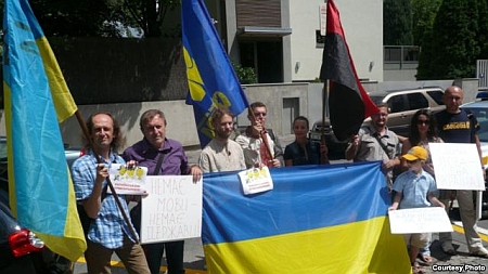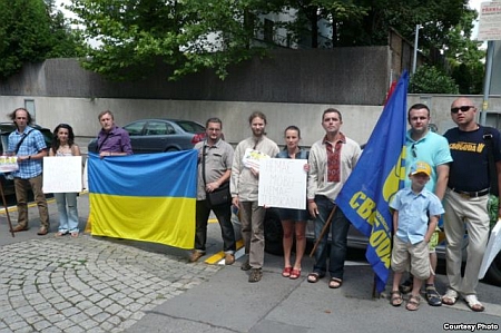 Вони так само, як і українці в Чехії, тримали в руках плакати щодо єдиної державної мови, а також плакат з фото Януковича і написом: "New dictator".